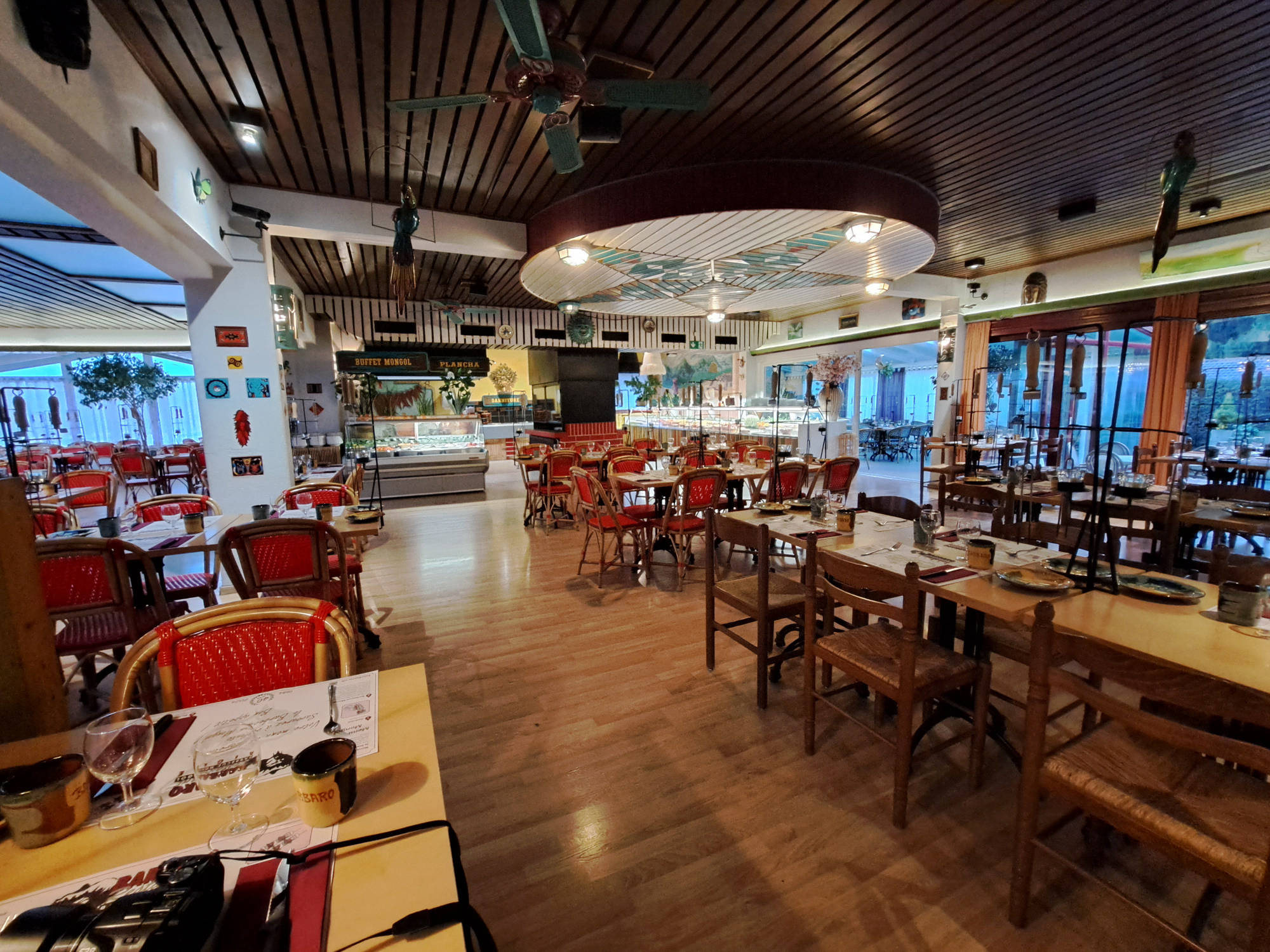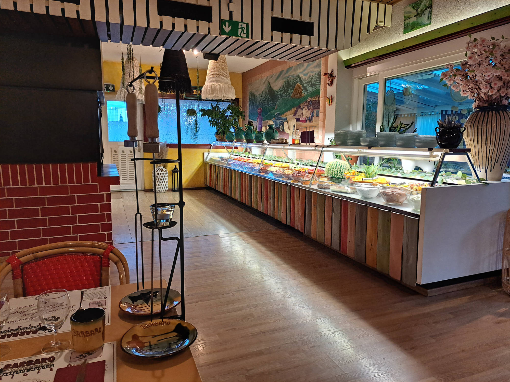 Dirigez-vous vers le buffet , Garnissez votre assiette, de fruits de mer, de légumes et de fruits. Assaisonnez le tout de diverses sauces et donner votre assiette à cuire au garçon, sur la « Plancha » (plaque en fonte géante)
